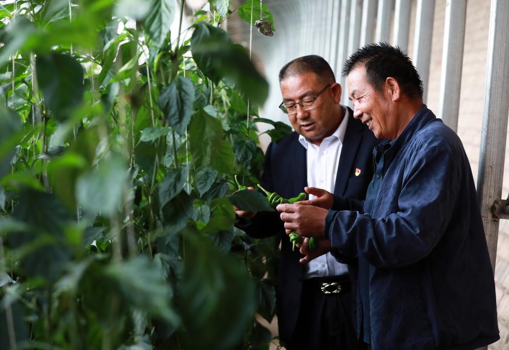 在富民新村種植區的日光溫室內,富民新村黨委書記兼村委會主任張延堂(左)在與種植戶何振田查看辣椒長勢。新華社記者 郭剛 攝