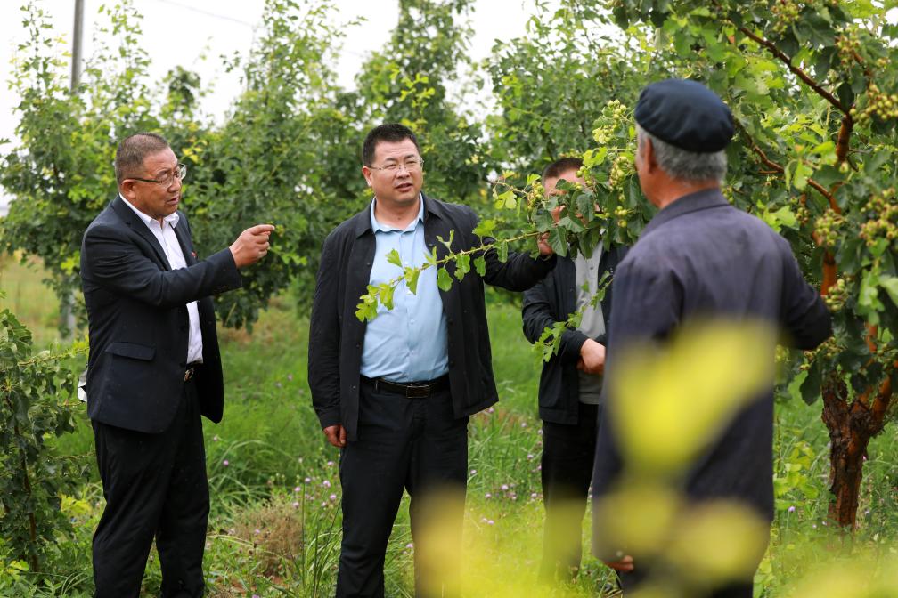 在富民新村的經濟林栽植區,古浪縣委組織部常務副部長俞永文(左二)與富民新村黨委書記兼村委會主任張延堂(左一)在和種植戶交流。新華社記者 郭剛 攝