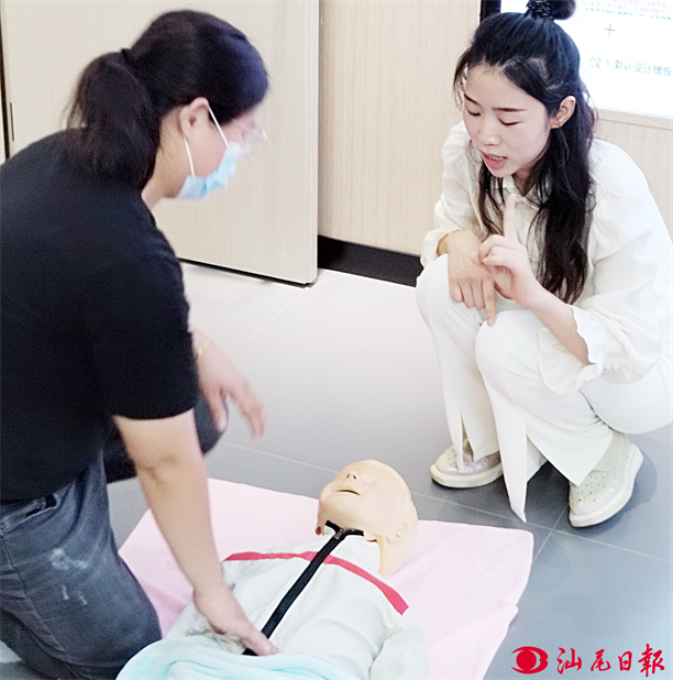 活動中,培訓老師采用理論知識與實操相結合的教學方式,指導前來參加培訓的轄區群眾,并現場示范心肺復蘇和海姆立克急救法的操作方式。圖為工作人員教授群眾心肺復蘇技能。