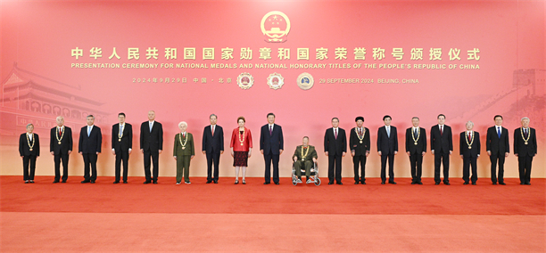 9月29日,中華人民共和國國家勛章和國家榮譽稱號頒授儀式在北京人民大會堂金色大廳隆重舉行。中共中央總書記、國家主席、中央軍委主席習近平向國家勛章和國家榮譽稱號獲得者頒授勛章獎章并發表重要講話。